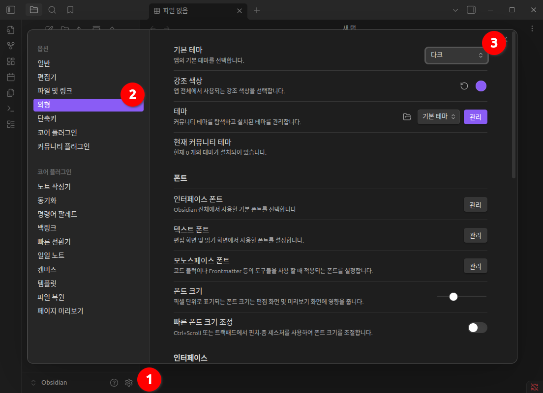 옵시디언 노트를 실행해 보니 흰색테마 말고도 눈에 거슬리게 있습니다.