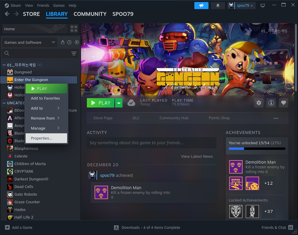 1. 플레이 할 게임을 선택하고 Properties(설정)에 들어갑니다.