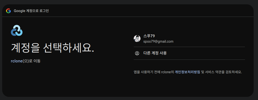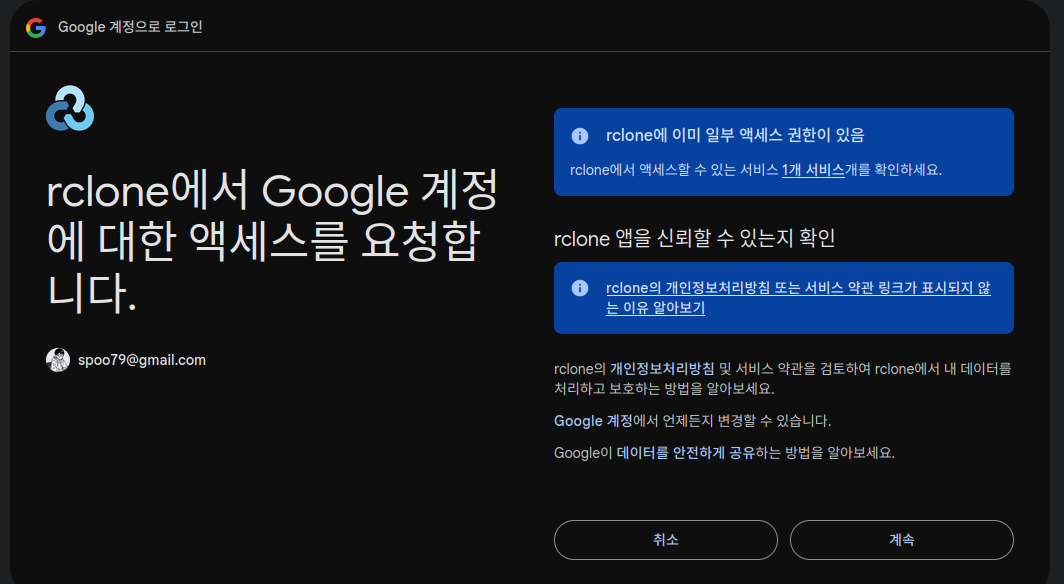 rclone에서 구글 계정 연동을 수락해줍니다.
