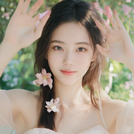 portrait of a beautiful woman in a summer dress in a flower garden, waving her hands and looking excited, masterpiece, best quality