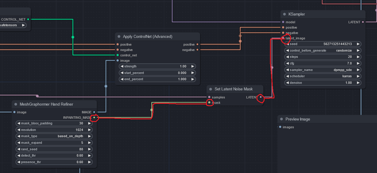8. MeshGraphormer Hand Refiner의 INPAINTING_MASK와 Set Latent Noise Master mask를 연결해 준다.