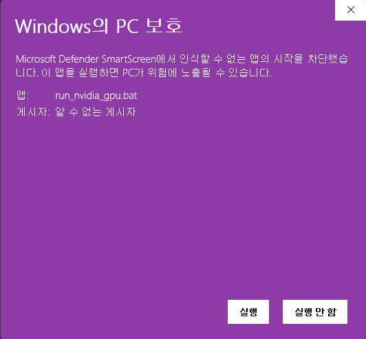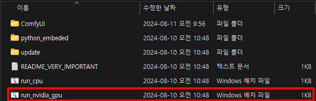 run_nvidia_gpu.bat 파일을 실행한다. (그래픽 카드가 없다면 run_cpu.bat 를 실행한다.)