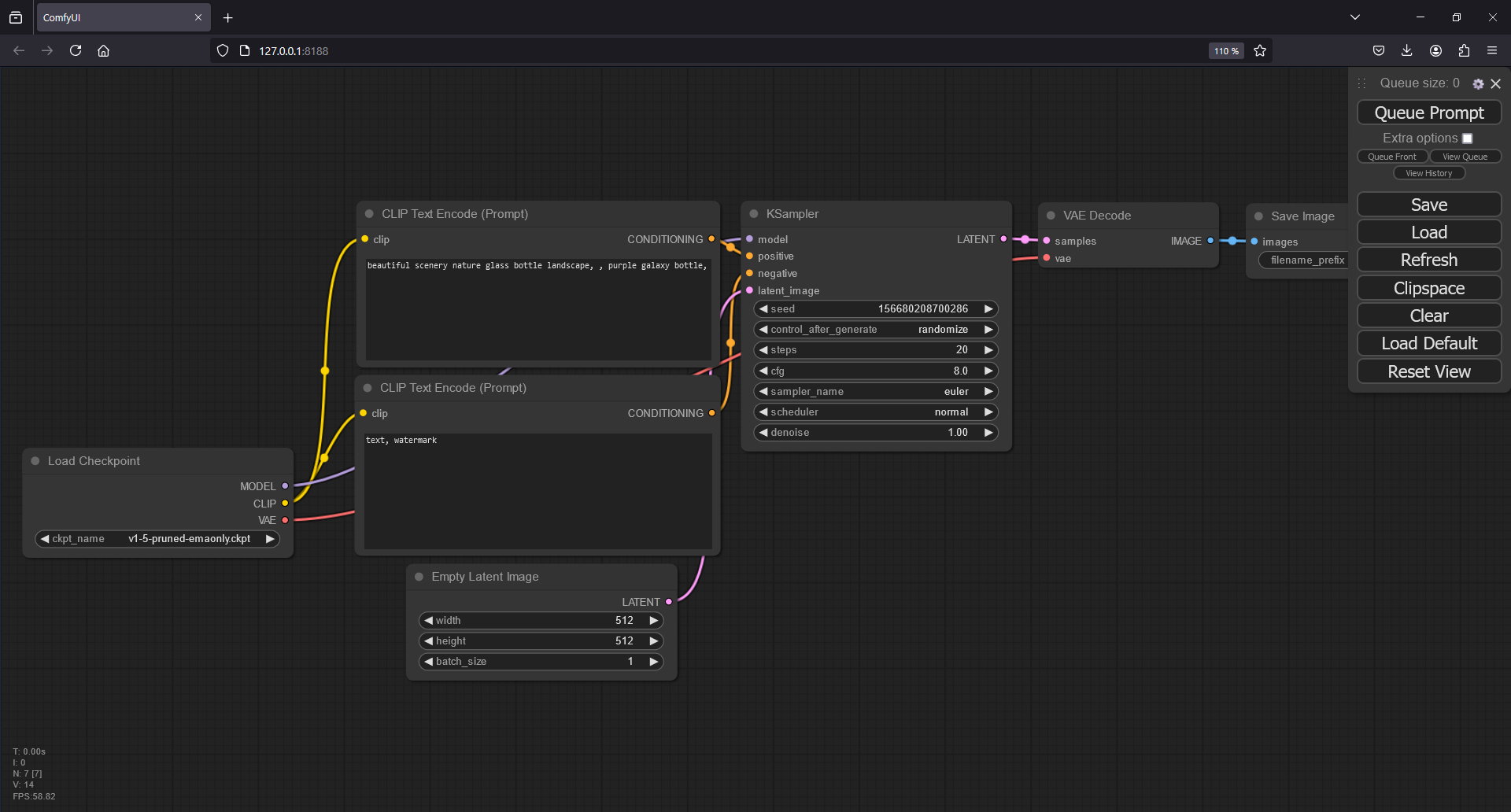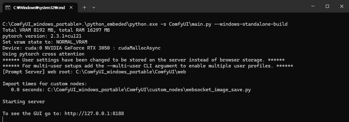 특별한 설치에 문제가 없었다면 위와 같이 브라우저 창에서 127.0.0.1:8188 주소가 표시되면