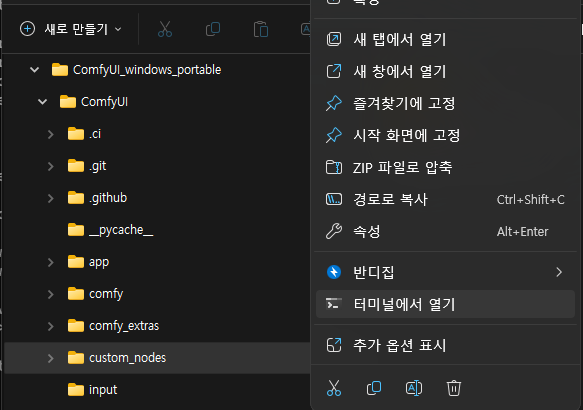 설치가 완료된 후에 ComfyUI가 설치된 경로에서 아래와 같이 custom_nodes라는 폴더를 찾아서 선택한 후