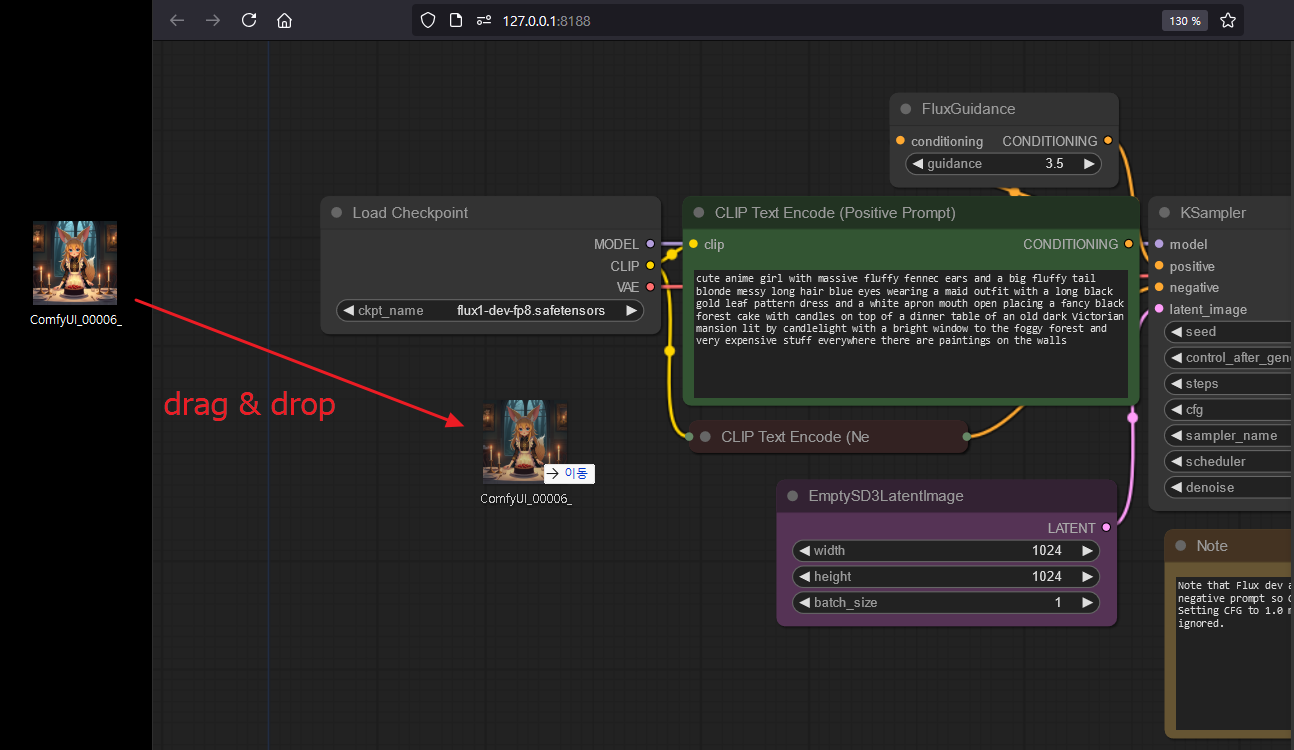 시키는 대로 이미지를 다운 받아서 드래그 앤 드랍을 해보니 FLUX DEV용 workflow로 변경되는 걸 확인할 수 있다.