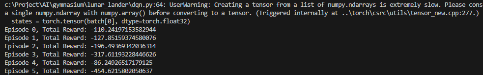 OpenAI LunarLander-v2 UserWarning: Creating a tensor from a list of numpy.ndarrays is extremely slow. 본문